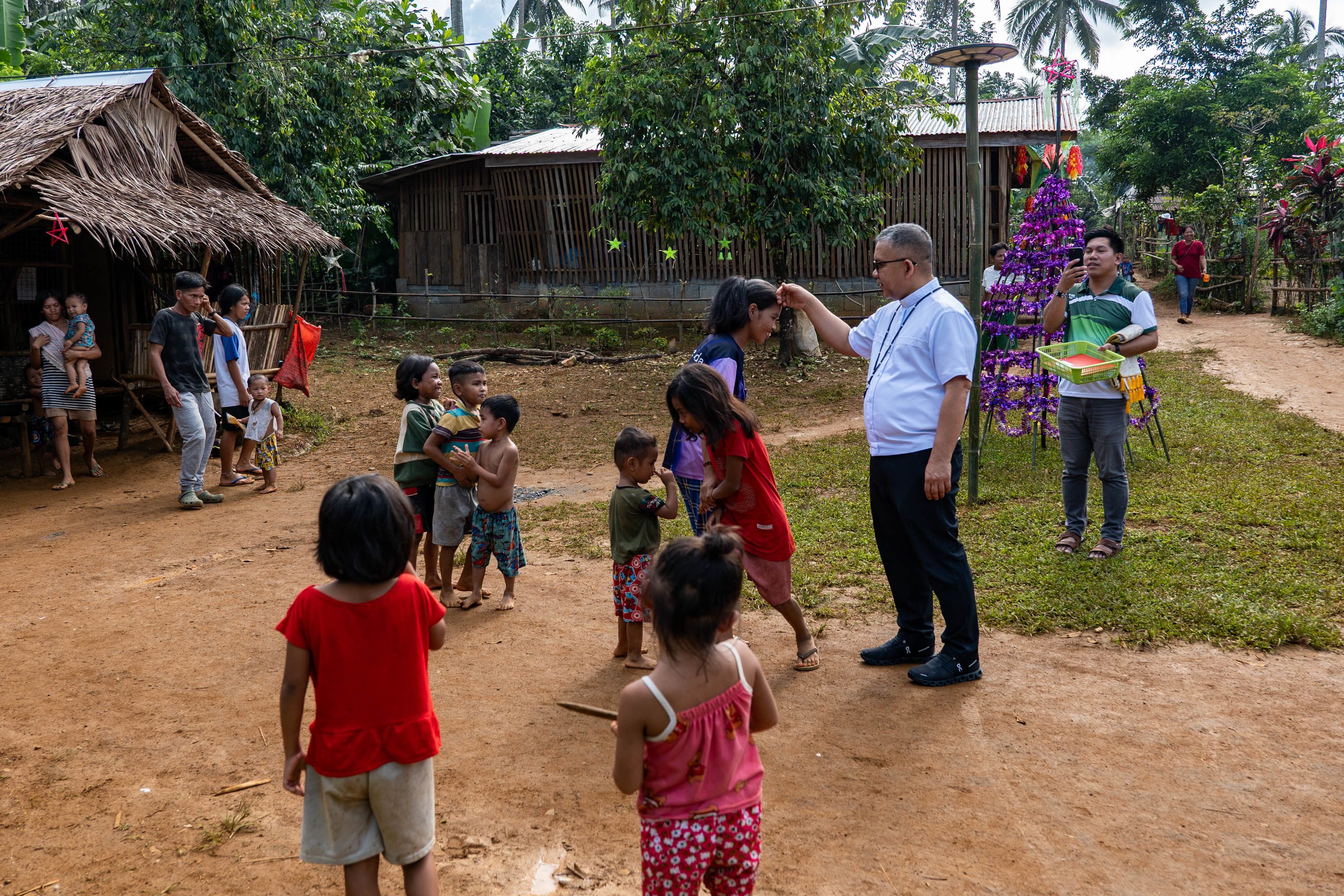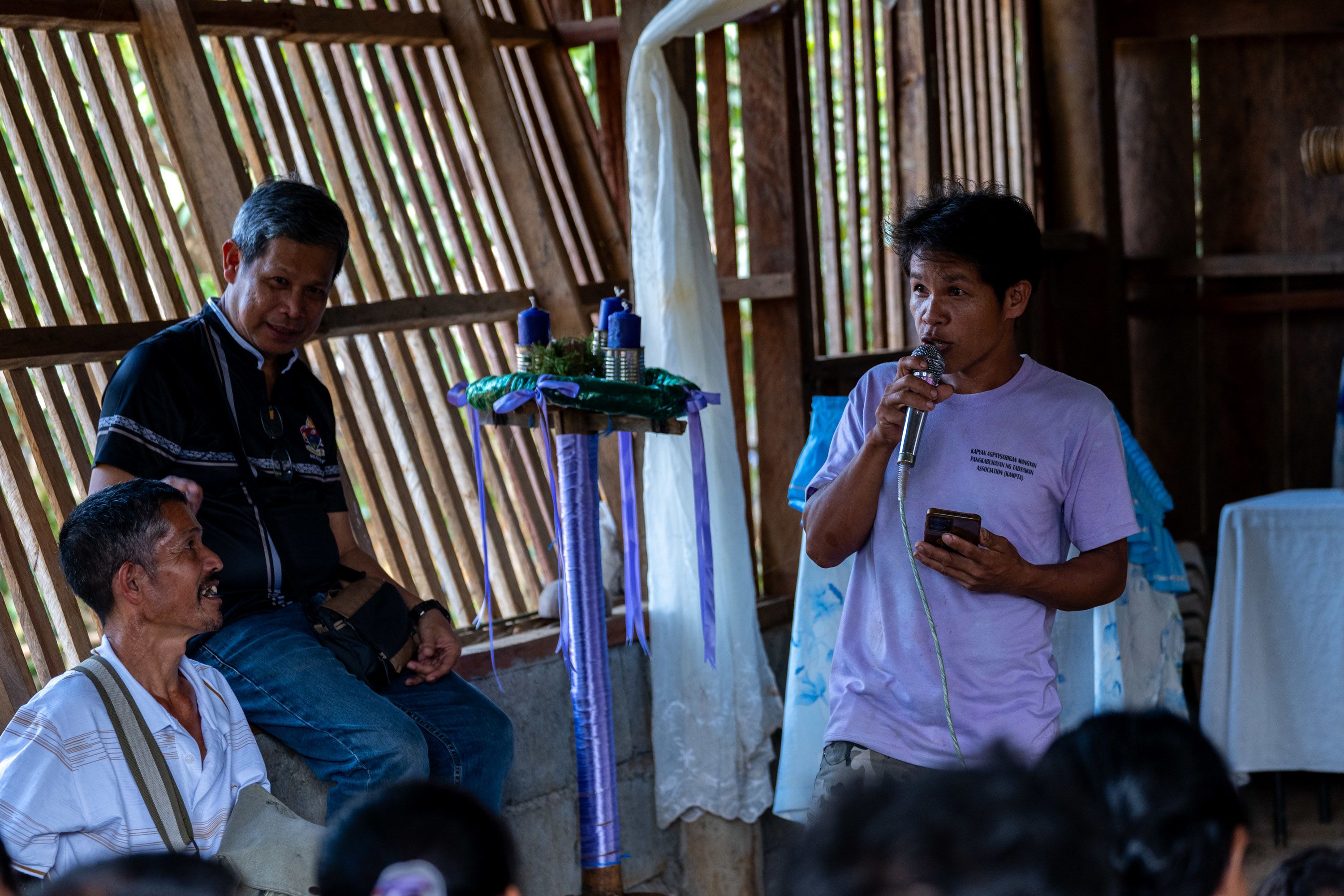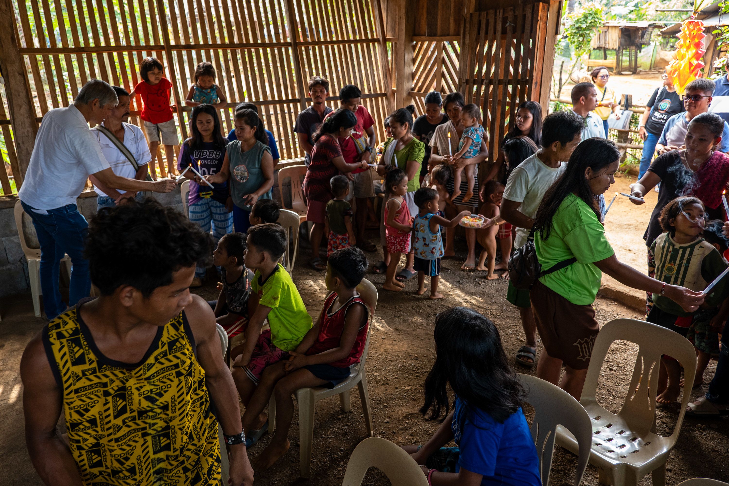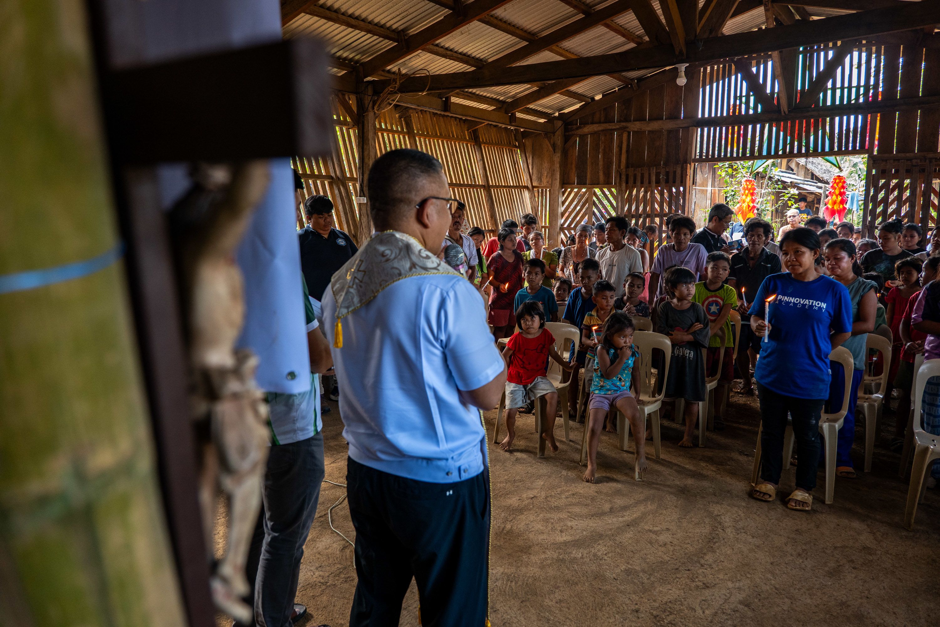 Bishop Moises Cuevas addresses members of the Mangyan-Tadyawan community during a candle-lighting ceremony held inside a village chapel in central Philippines, marking the blessing of newly installed solar power systems for off-grid households.