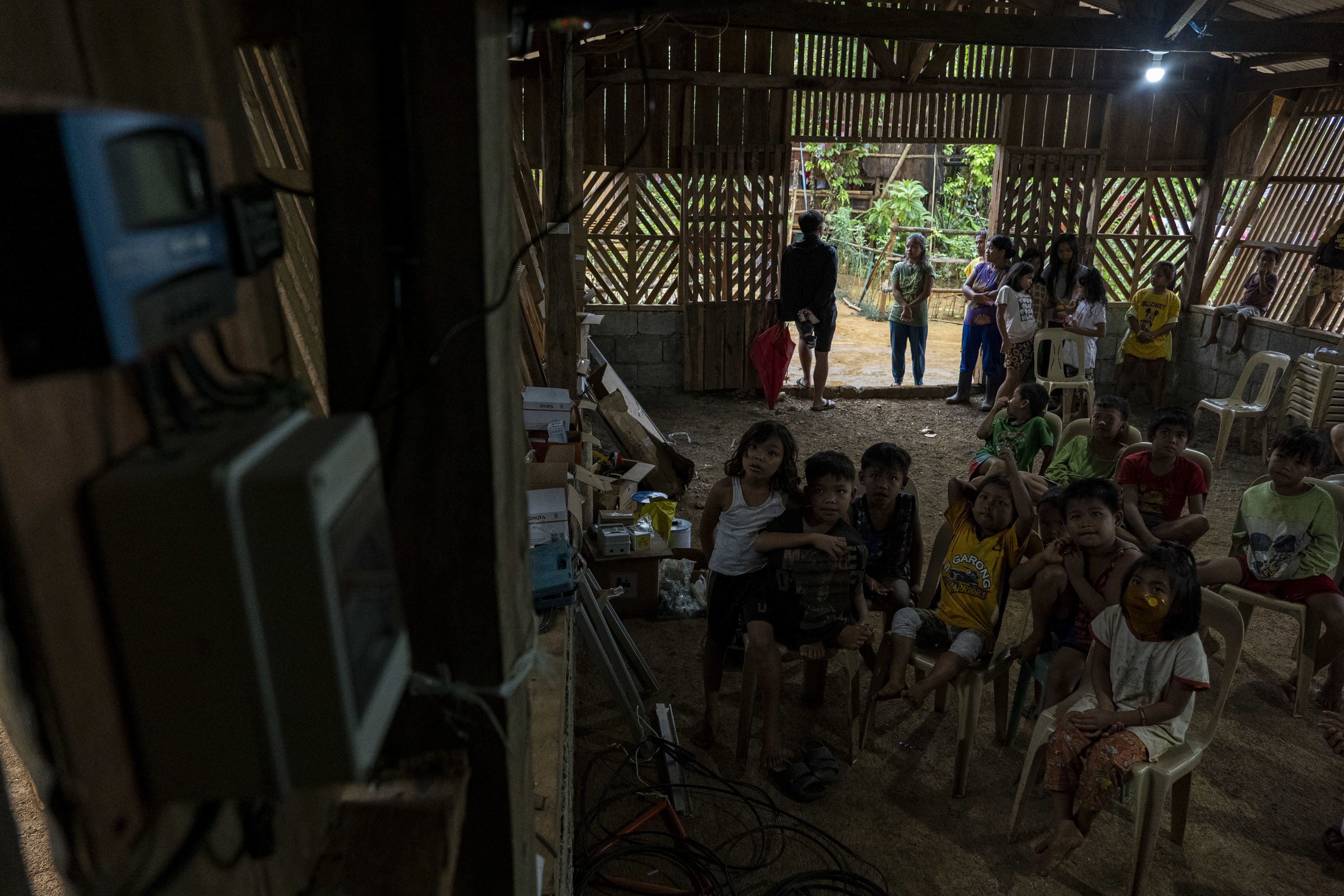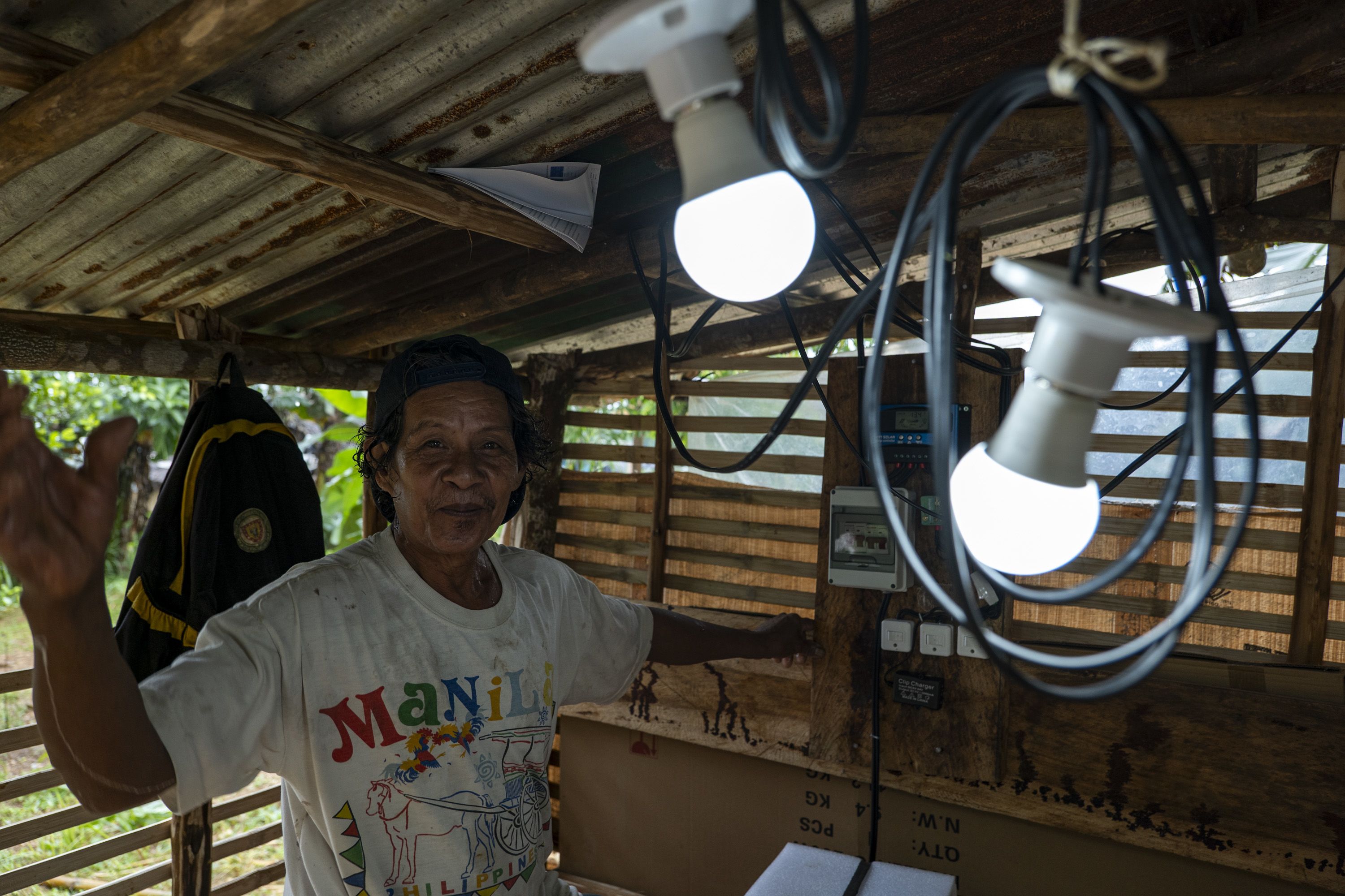 Rudy del Mundo, 64, an elder of the Mangyan-Tadyawan community, stands inside his home in Victoria town, Oriental Mindoro, where newly installed light bulbs illuminate the space.