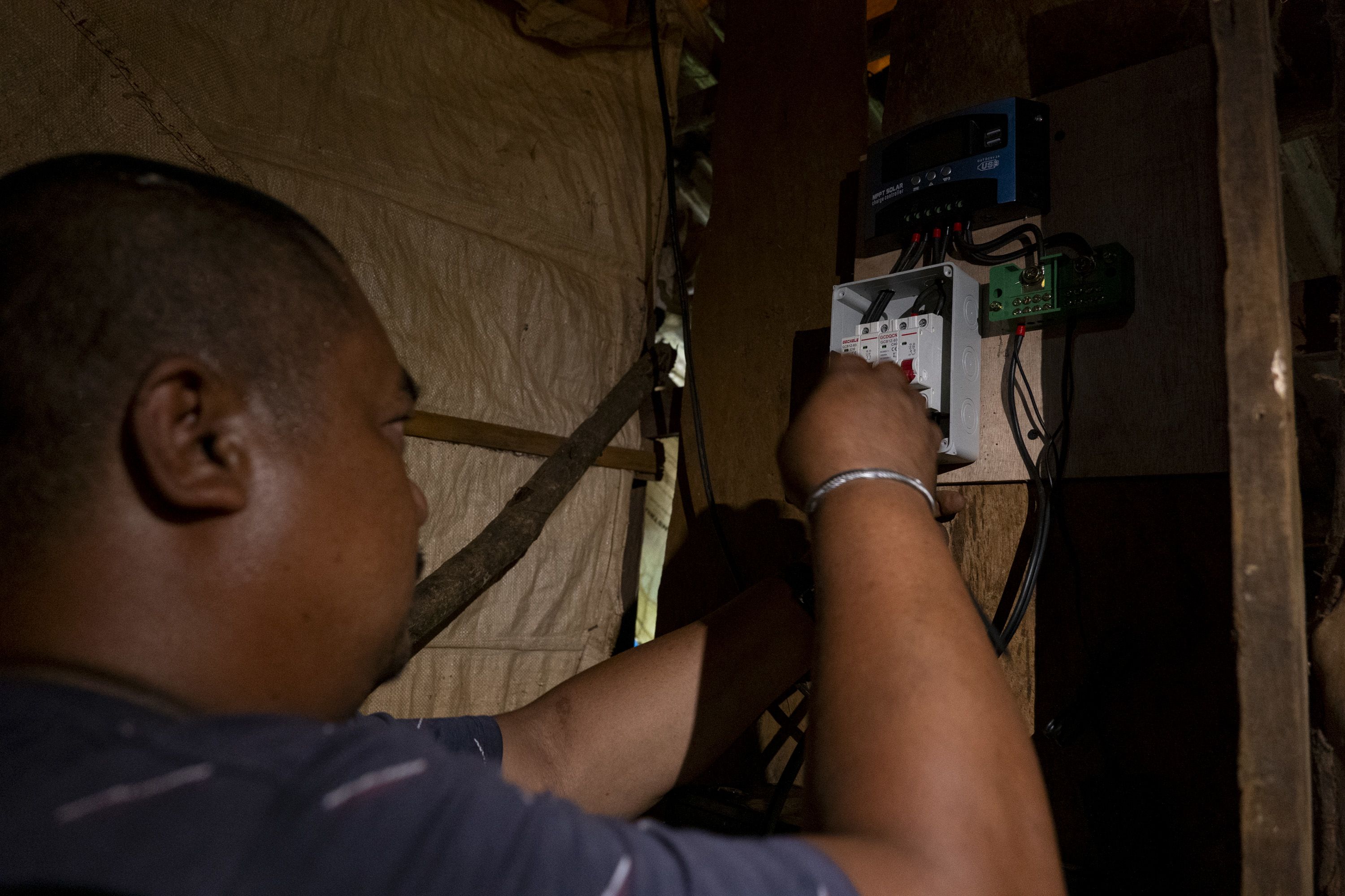 A technician installs a solar power system inside a home in Victoria town, Oriental Mindoro, as part of a community-based renewable energy project.