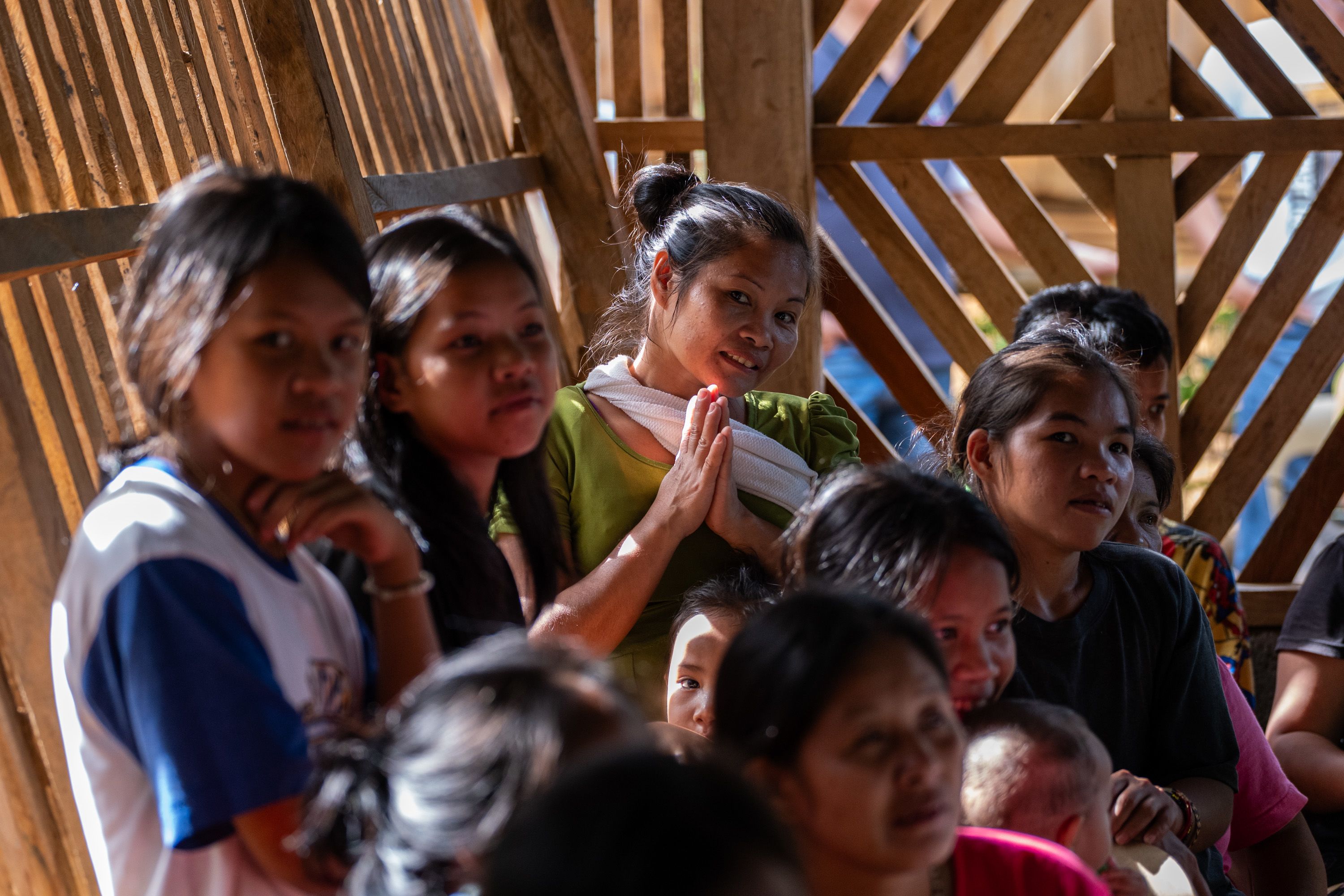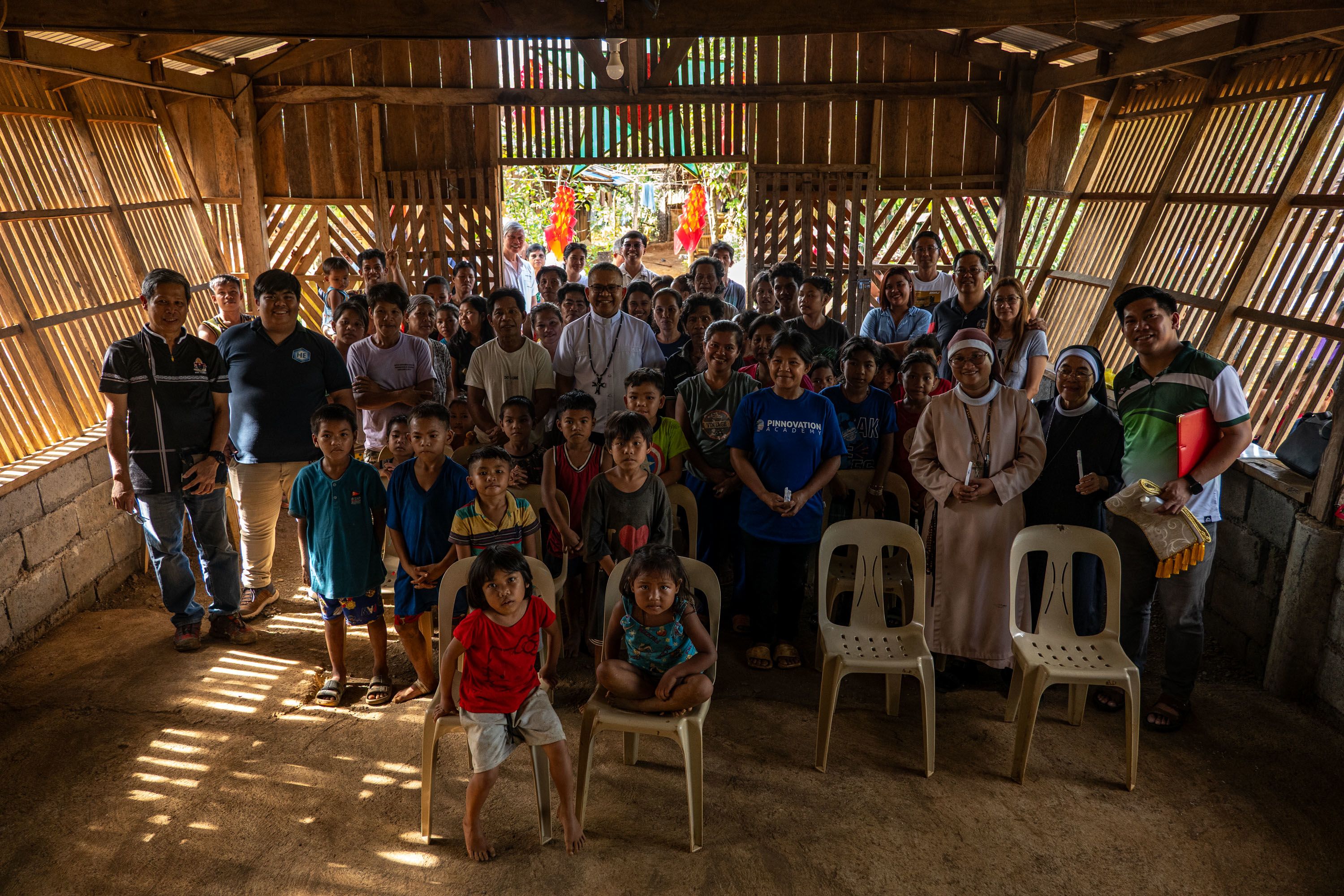 Members of the Mangyan-Tadyawan community, including children and elders, gather inside a village hall during a blessing and community activity marking the installation of a solar power system in a remote area of Victoria, Oriental Mindoro. The event brought together families, Church workers, and partners supporting access to clean and reliable electricity in off-grid Indigenous communities.
