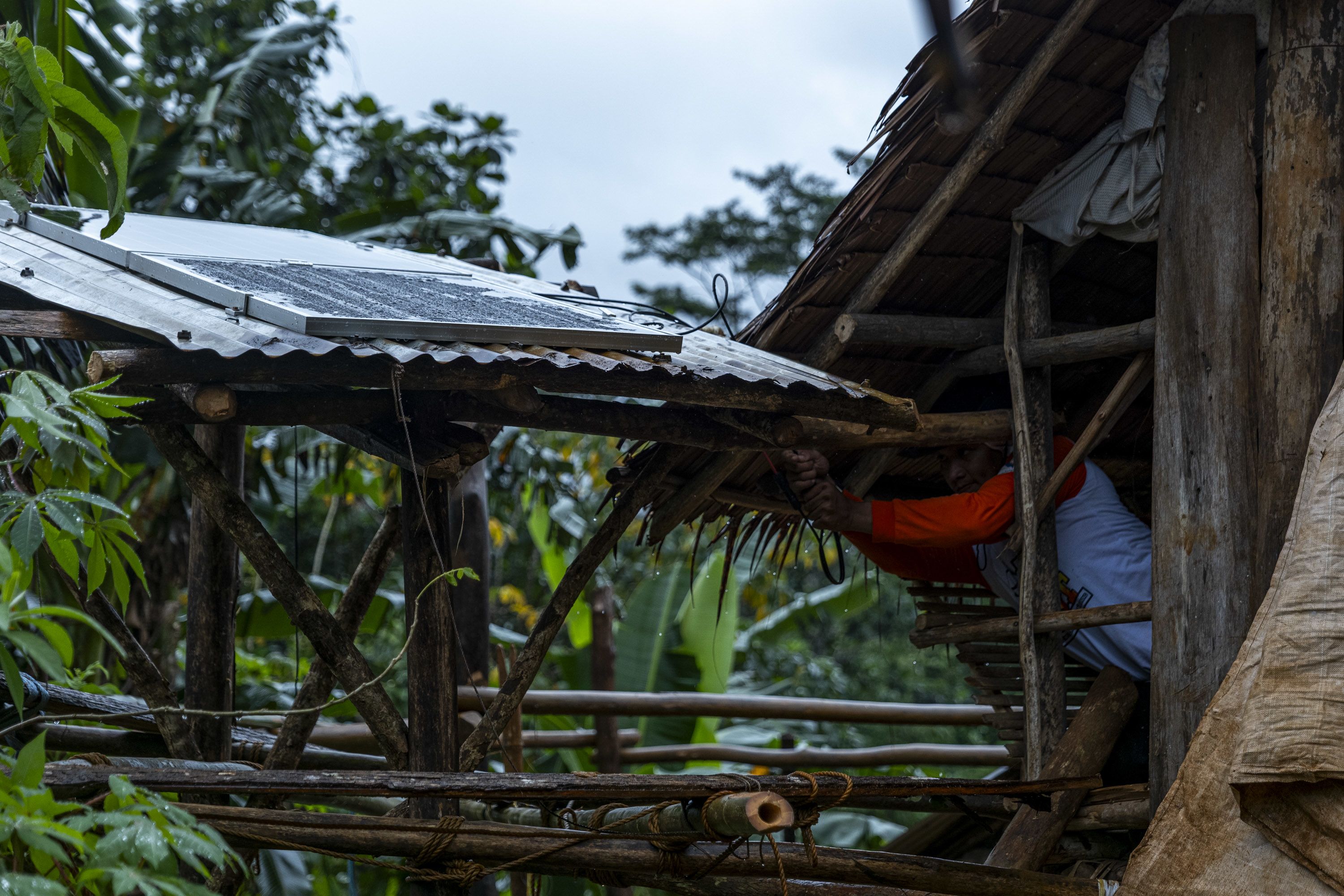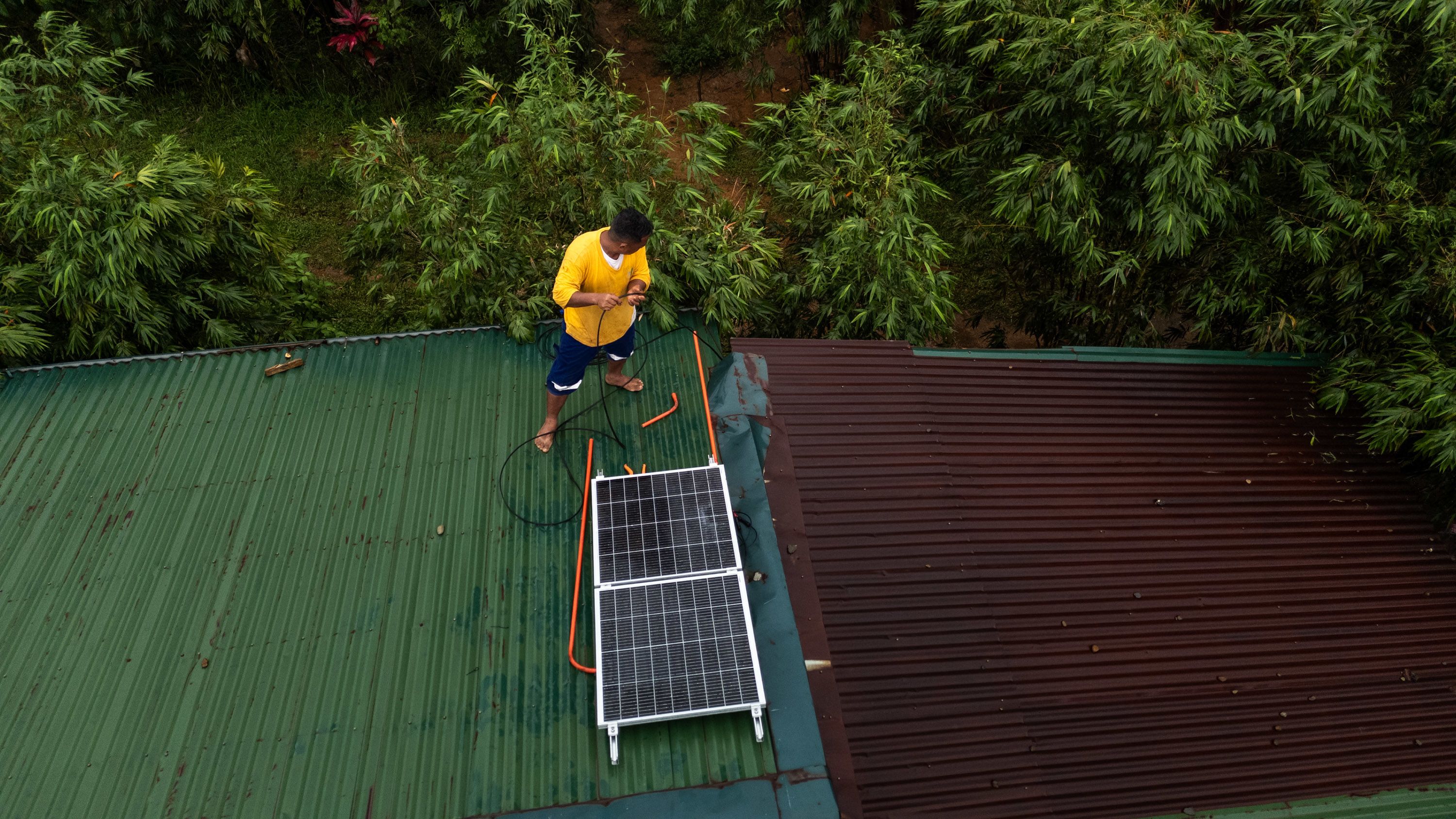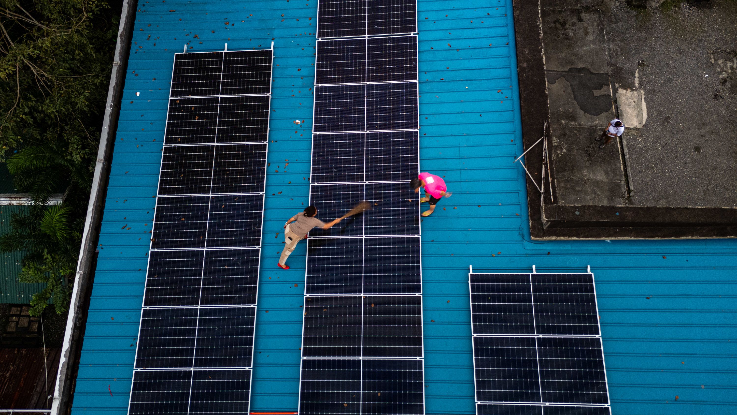 A worker installs solar panels on the roof of a communal facility of an indigenous community in Victoria town, Oriental Mindoro, as part of a community-based renewable energy project.