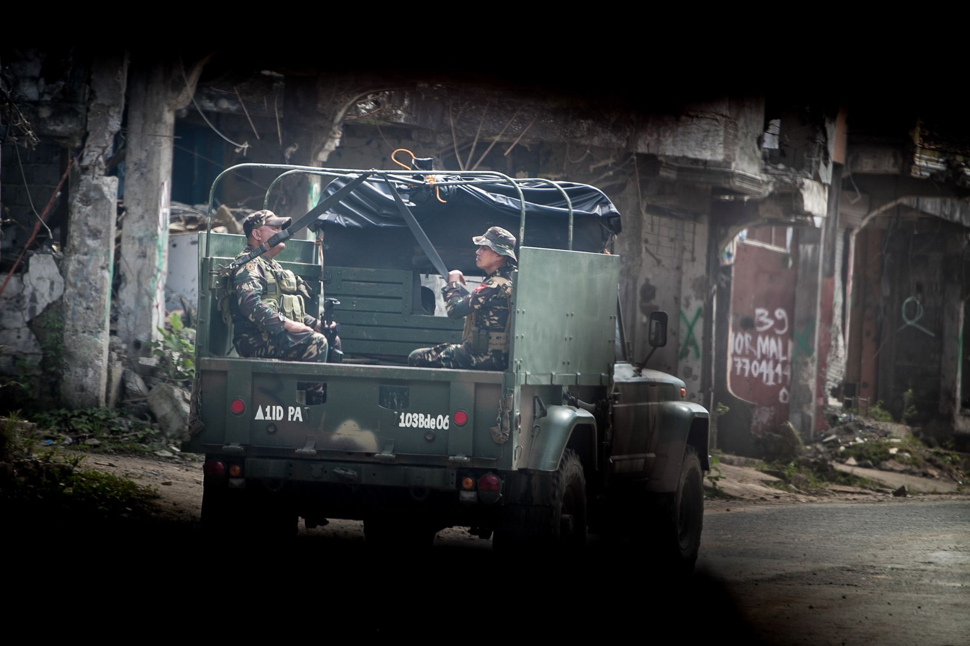 Philippine Army soldiers barricade the road to prevent the exodus of at least 1,600 tribal people who fled their village due to military operations in this photograph taken in 2018 in Mindanao.