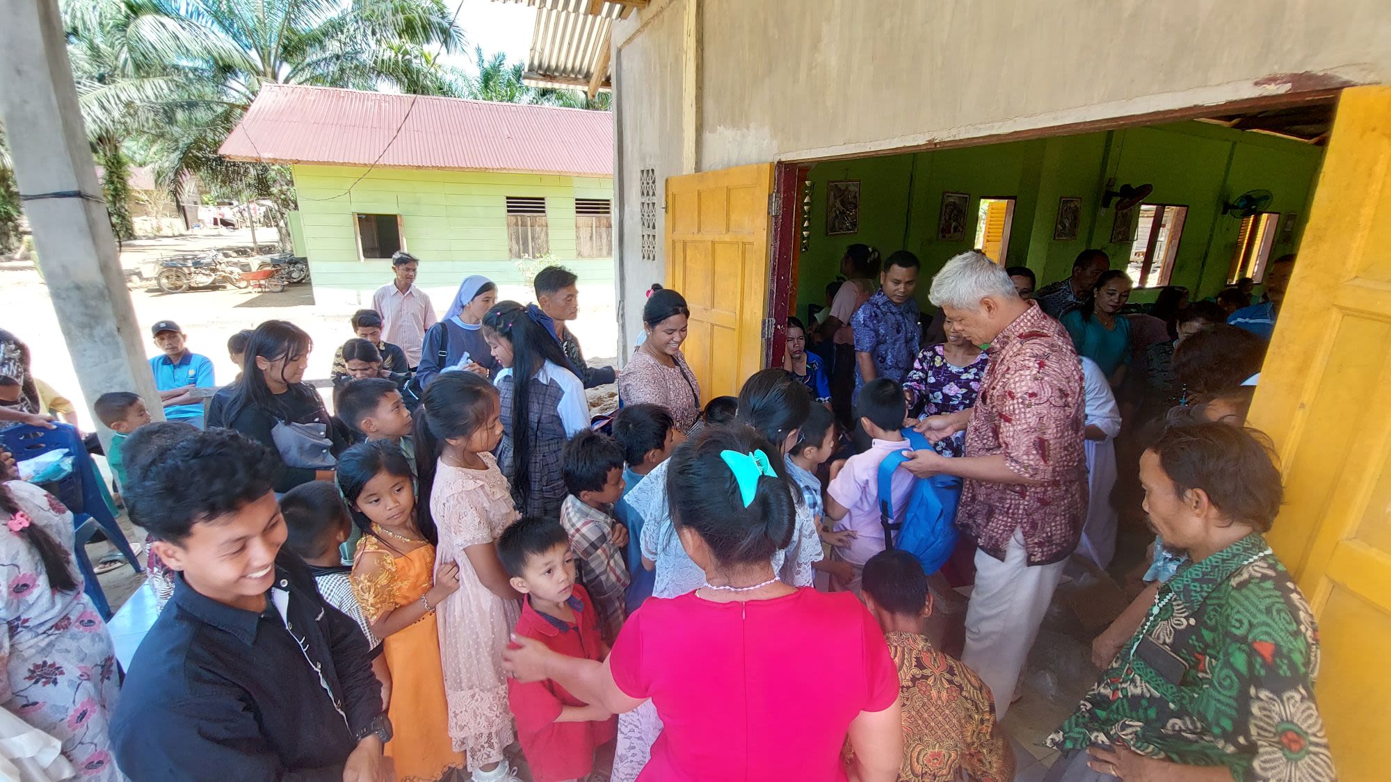 Children gather at a parish chapel in North Sumatra as volunteers distribute assistance to families affected by the November 2025 floods, bringing relief to communities still recovering from the disaster.