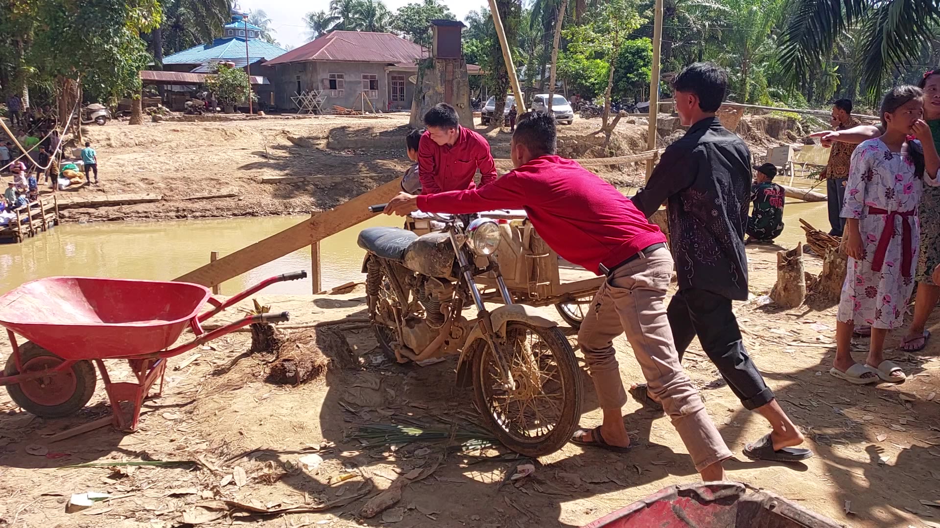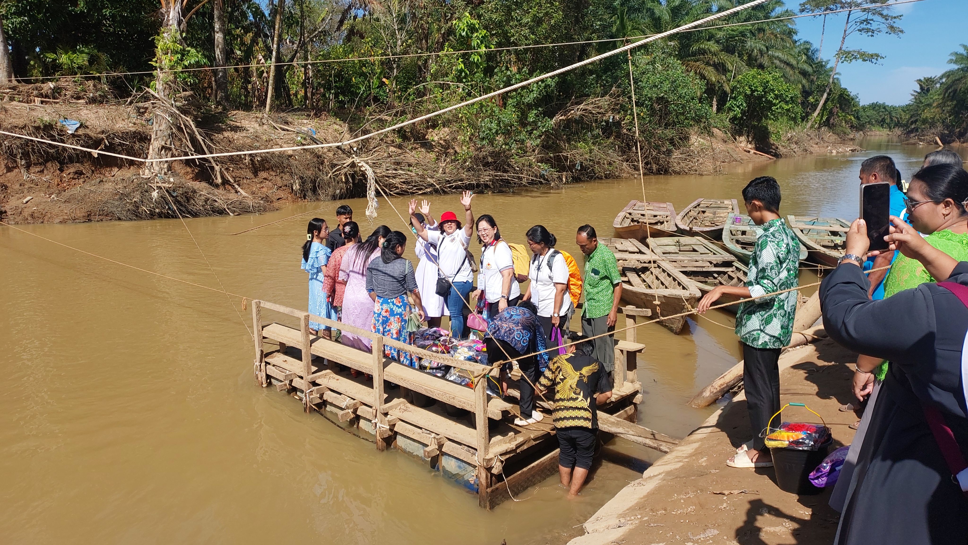 Religious sisters, volunteers, and local residents load aid supplies onto small wooden boats to reach remote villages in North Sumatra, where damaged roads have left flood-affected communities accessible only by river