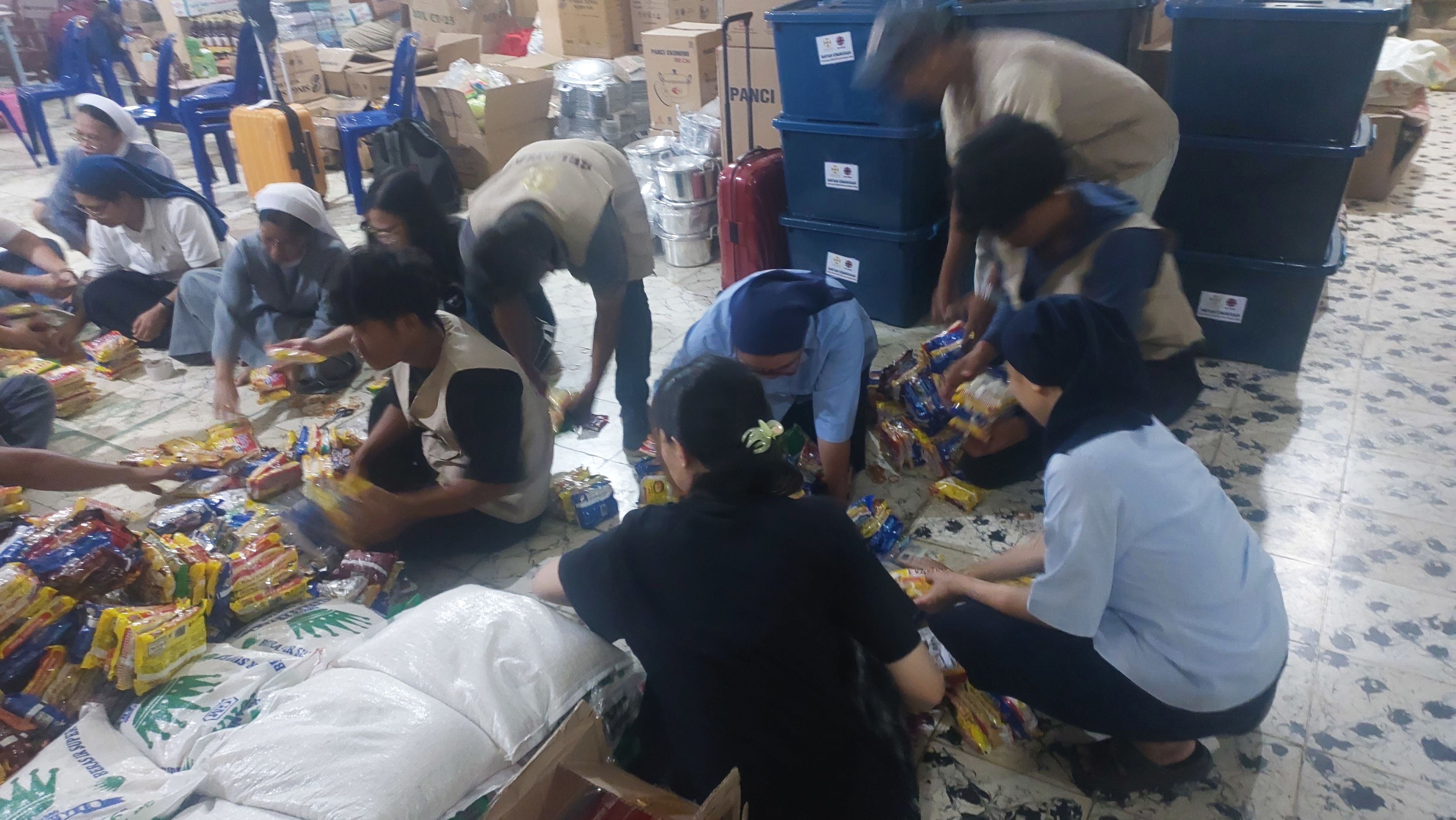 Volunteers and religious sisters sort and pack relief goods for distribution to flood-affected communities in North Sumatra following the November 2025 disaster.