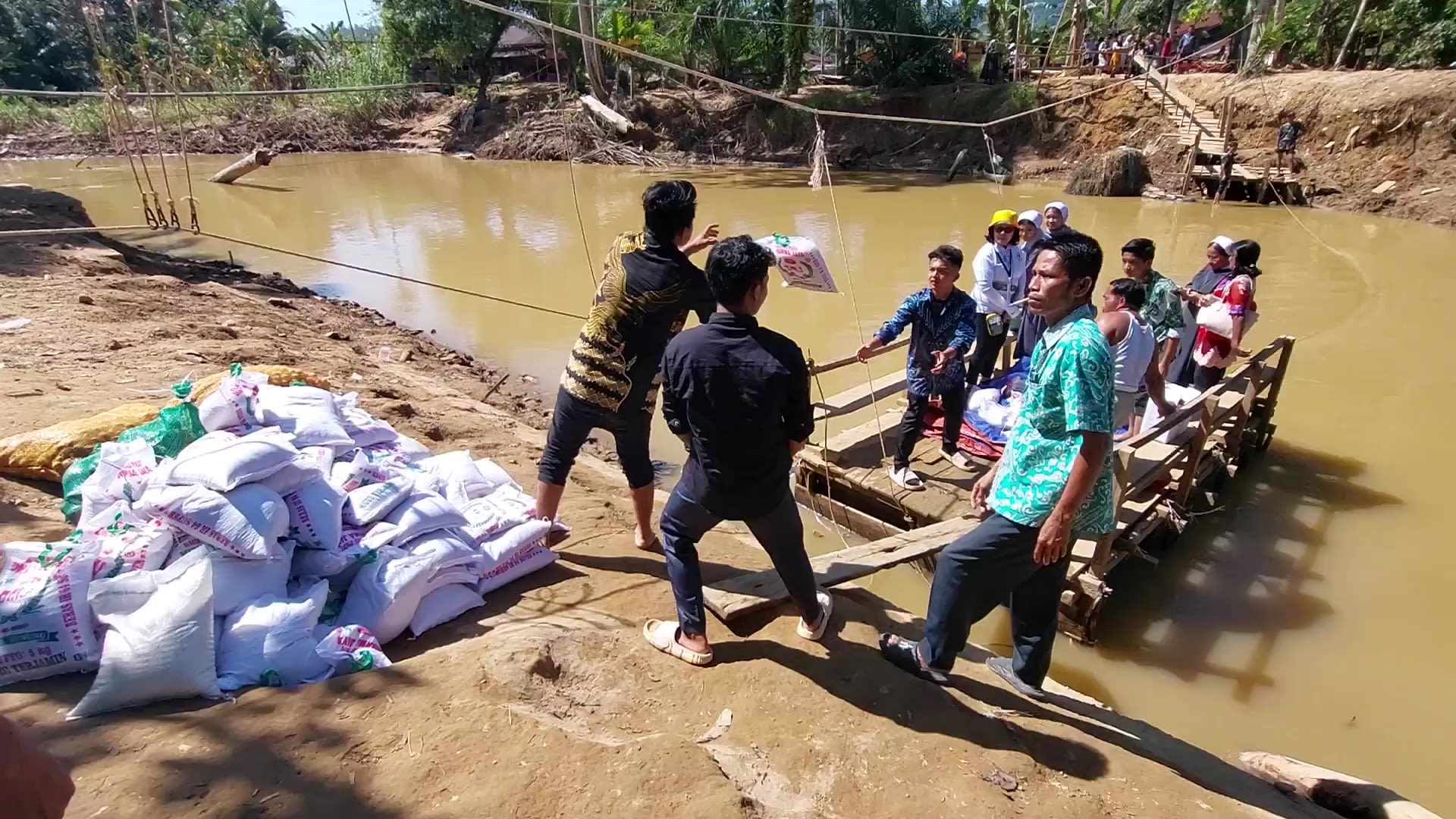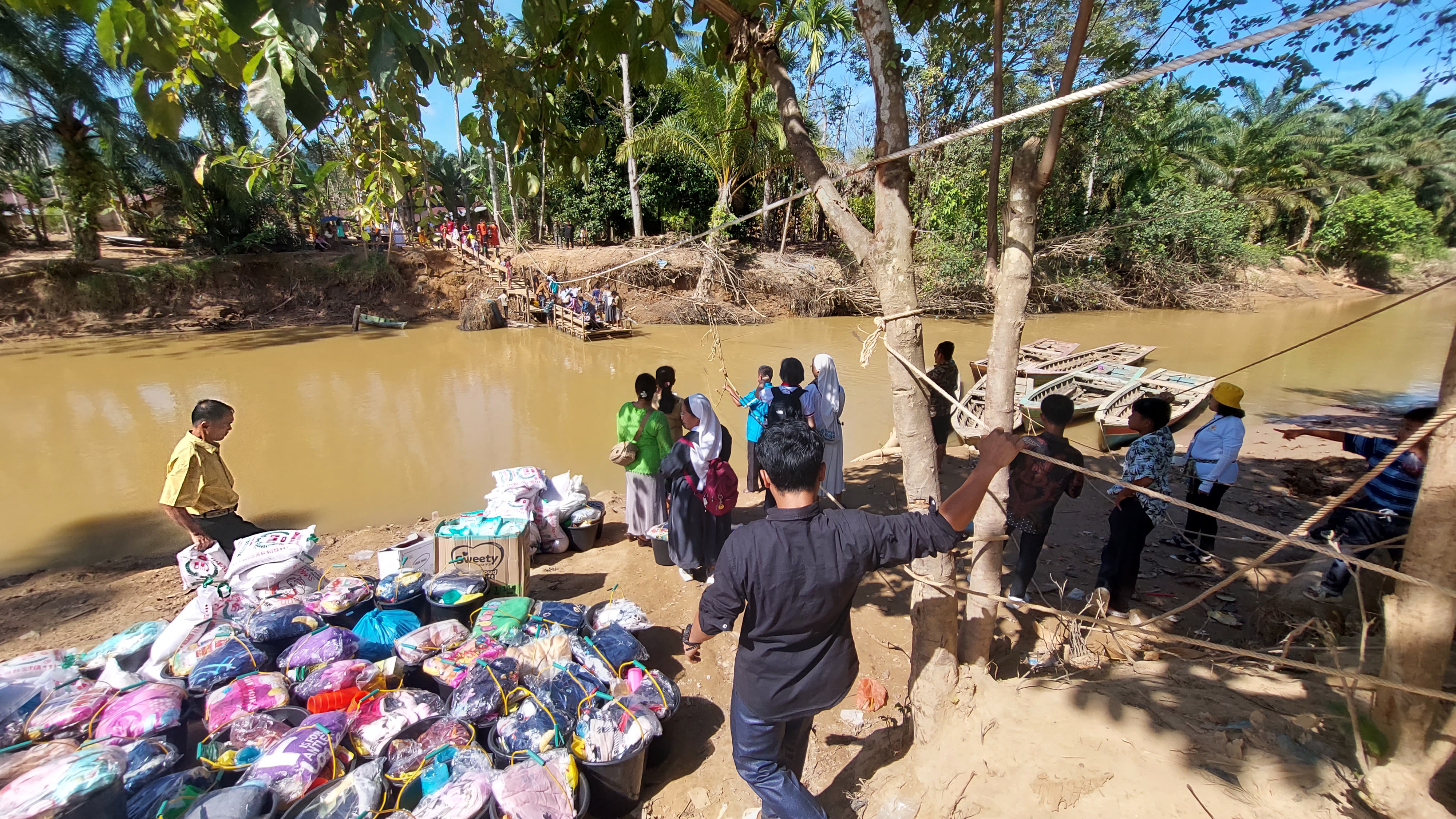 Stacks of relief goods wait on a riverbank in North Sumatra as volunteers and religious sisters ferry supplies by raft to flood-hit villages still inaccessible by road after the November 2025 disaster.