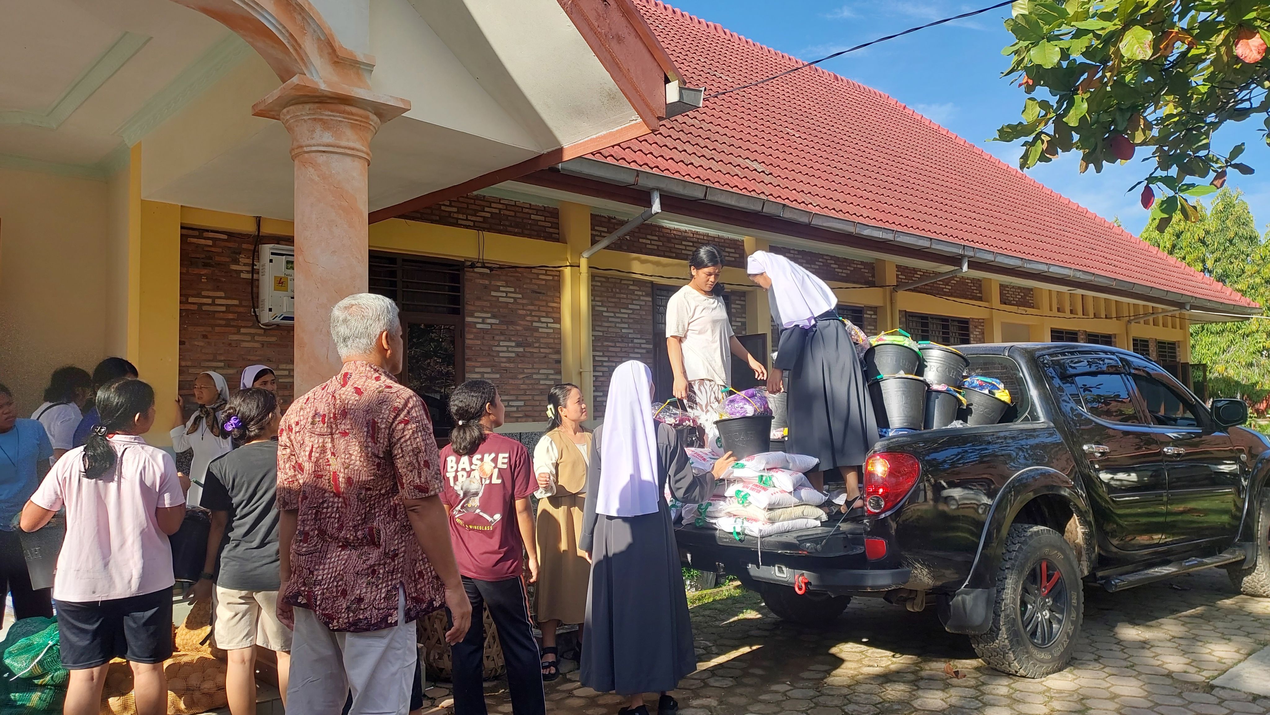 Religious sisters and volunteers unload rice, household supplies, and aid packages from a pickup truck at a parish compound in North Sumatra, as assistance continues to reach communities affected by the November 2025 floods and landslides.