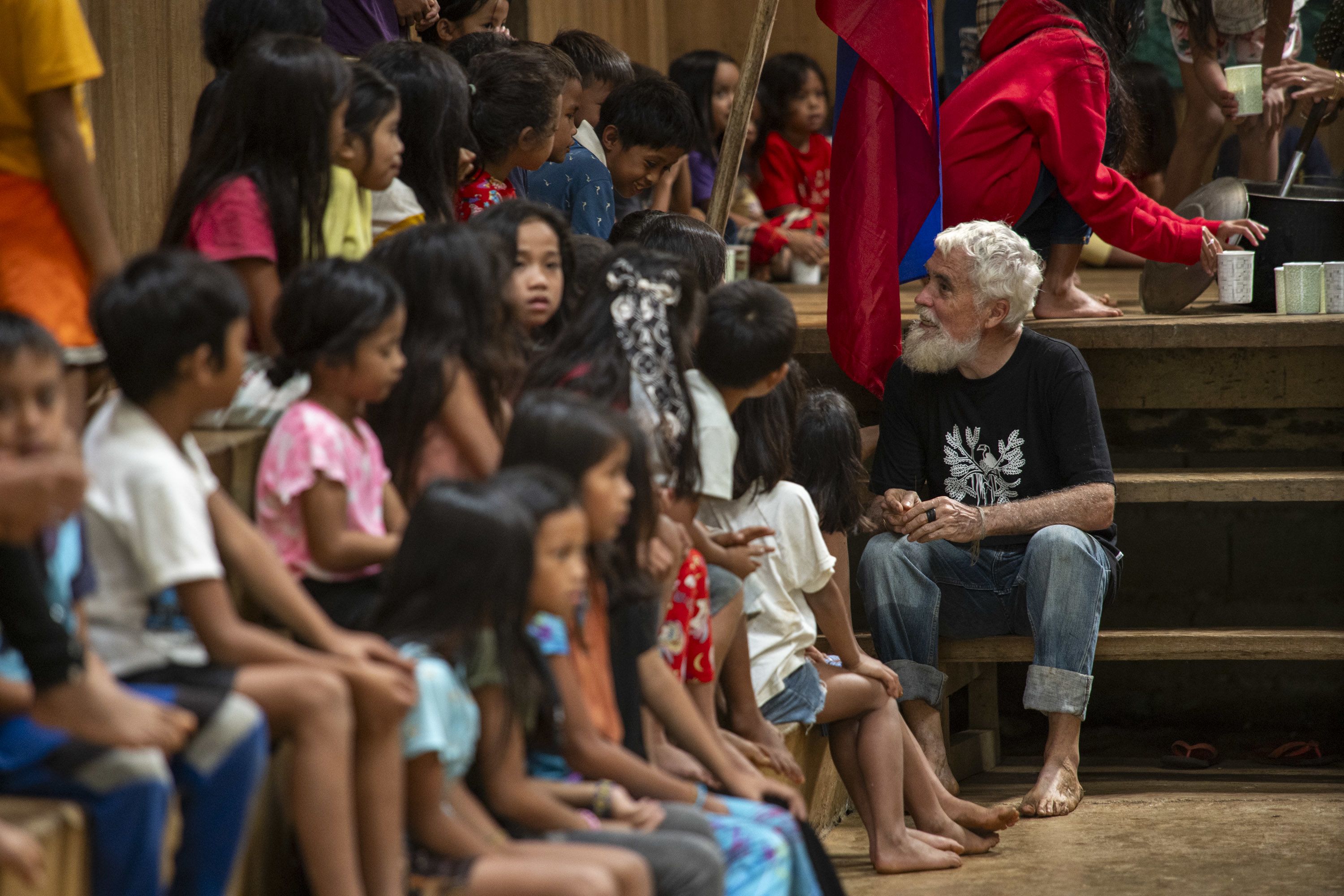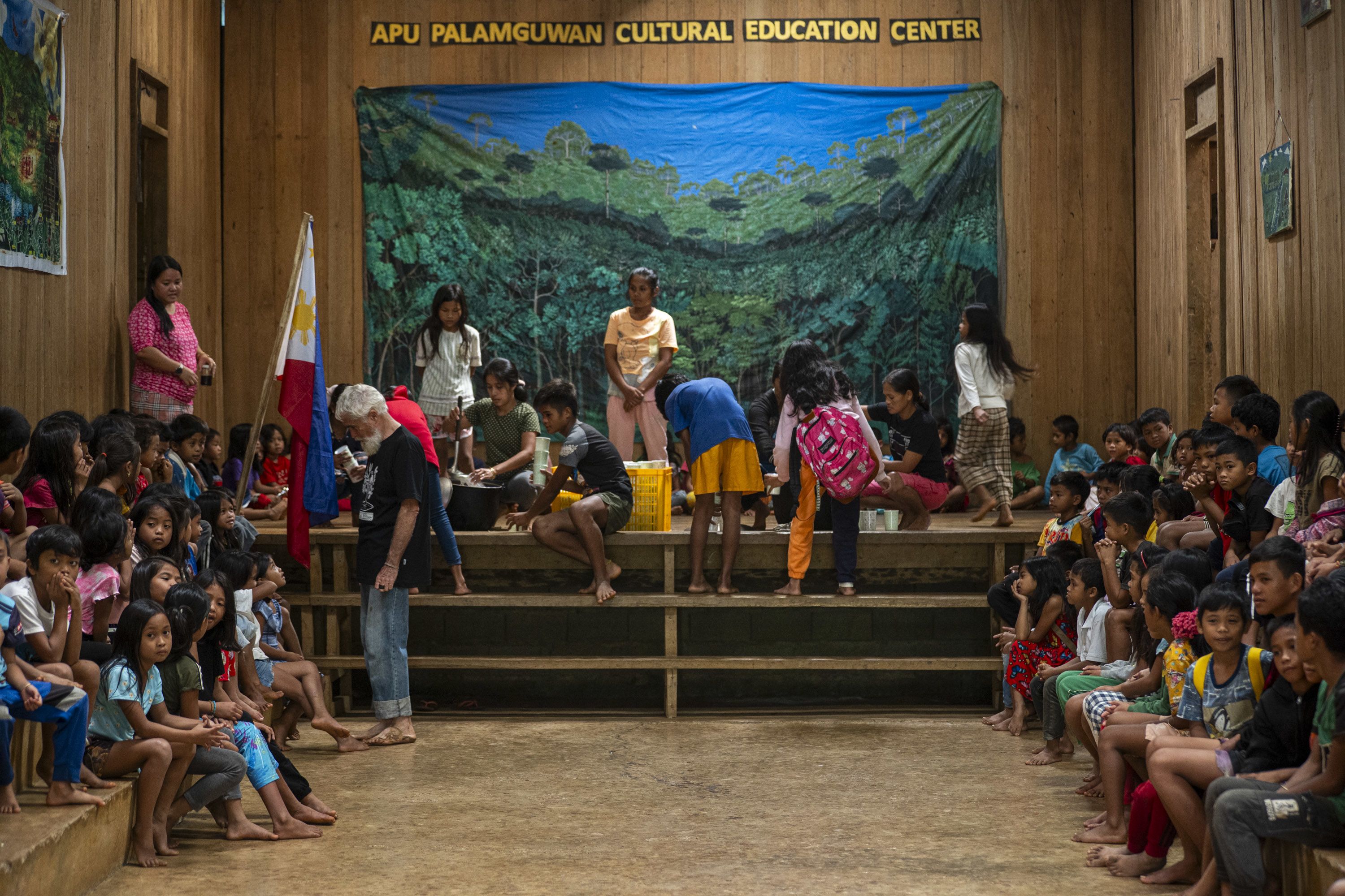 Fr. Pedro Walpole engages with students at the Apu Palamguwan Cultural Education Center in Bendum, as children from the Indigenous Pulangiyen community gather for their glass of morning milk before starting their lessons.