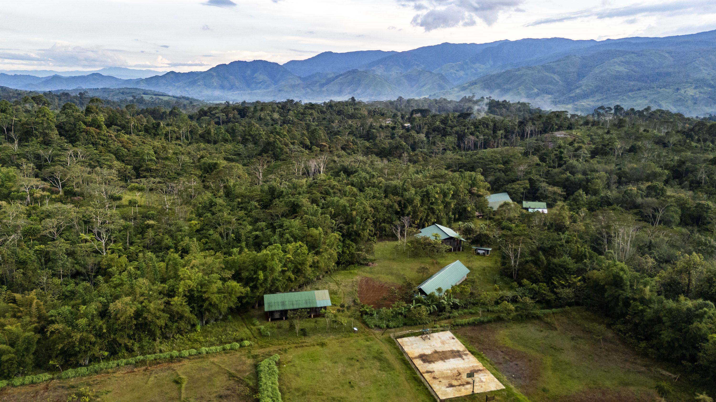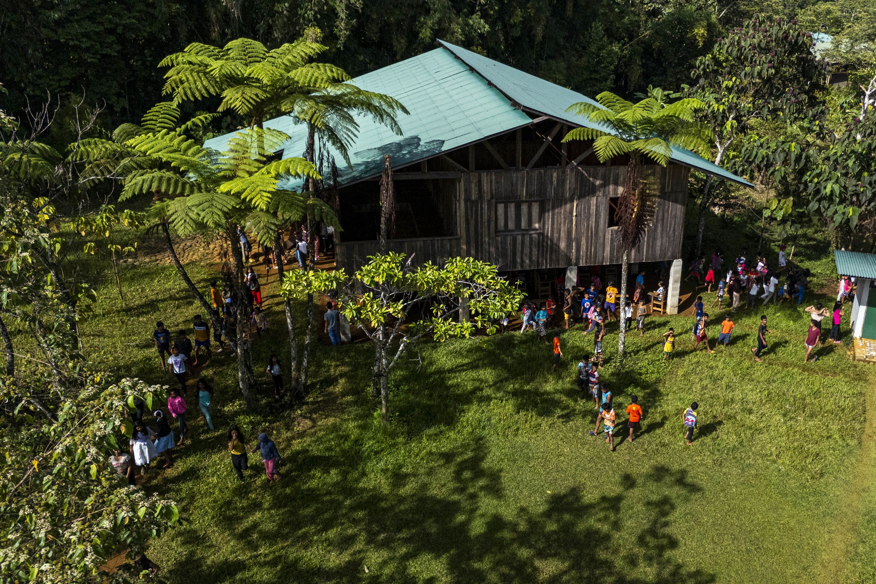 Drone shot of one of the classrooms at Apu Palamguwan Cultural Education Center in Bendum, where Indigenous children from the Pulangiyen community gather for classes focused on their culture, environment, and sustainable living.
