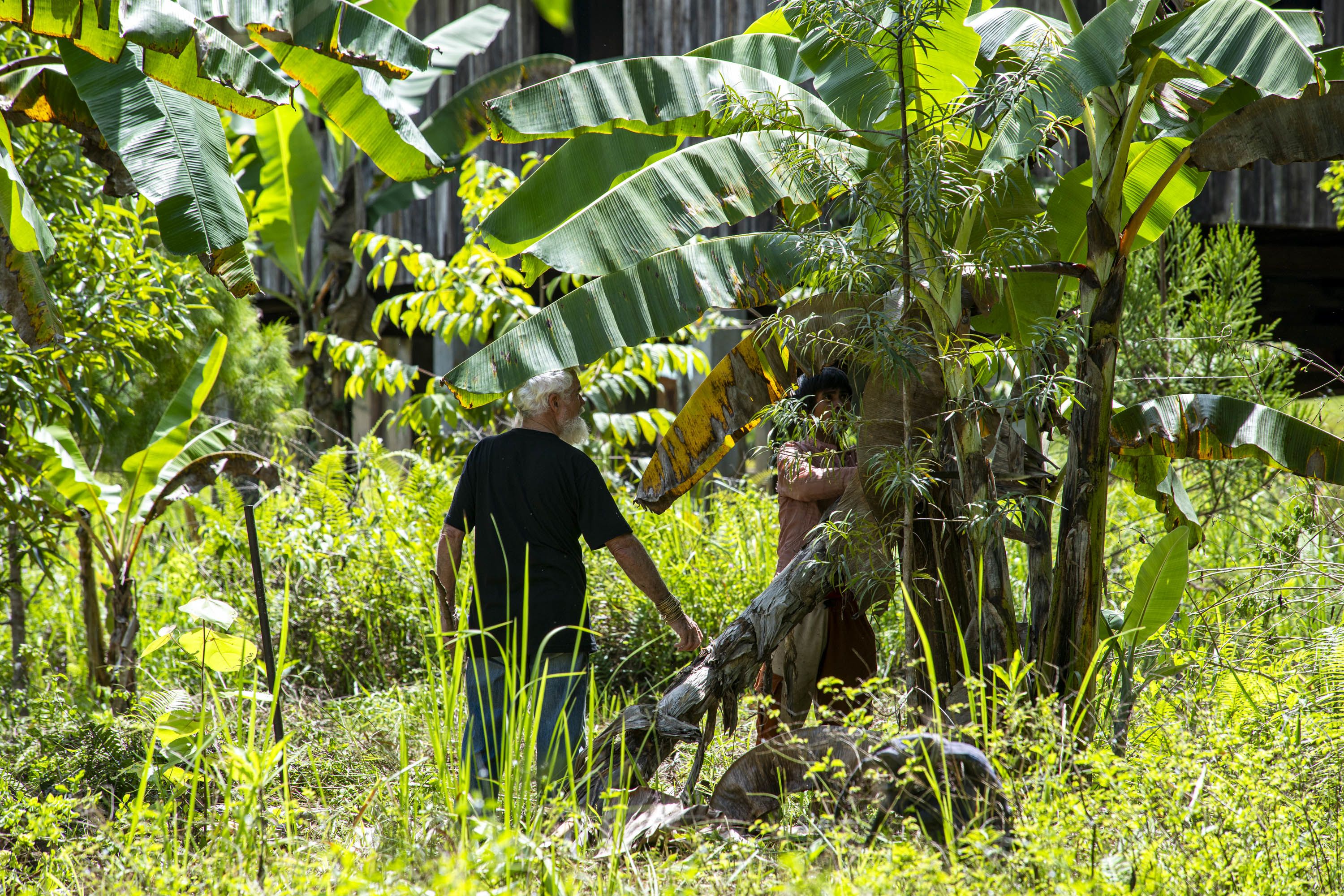 Fr. Pedro Walpole gives instructions to a member of the Pulangiyen community who is clearing the brush to allow the trees to grow.