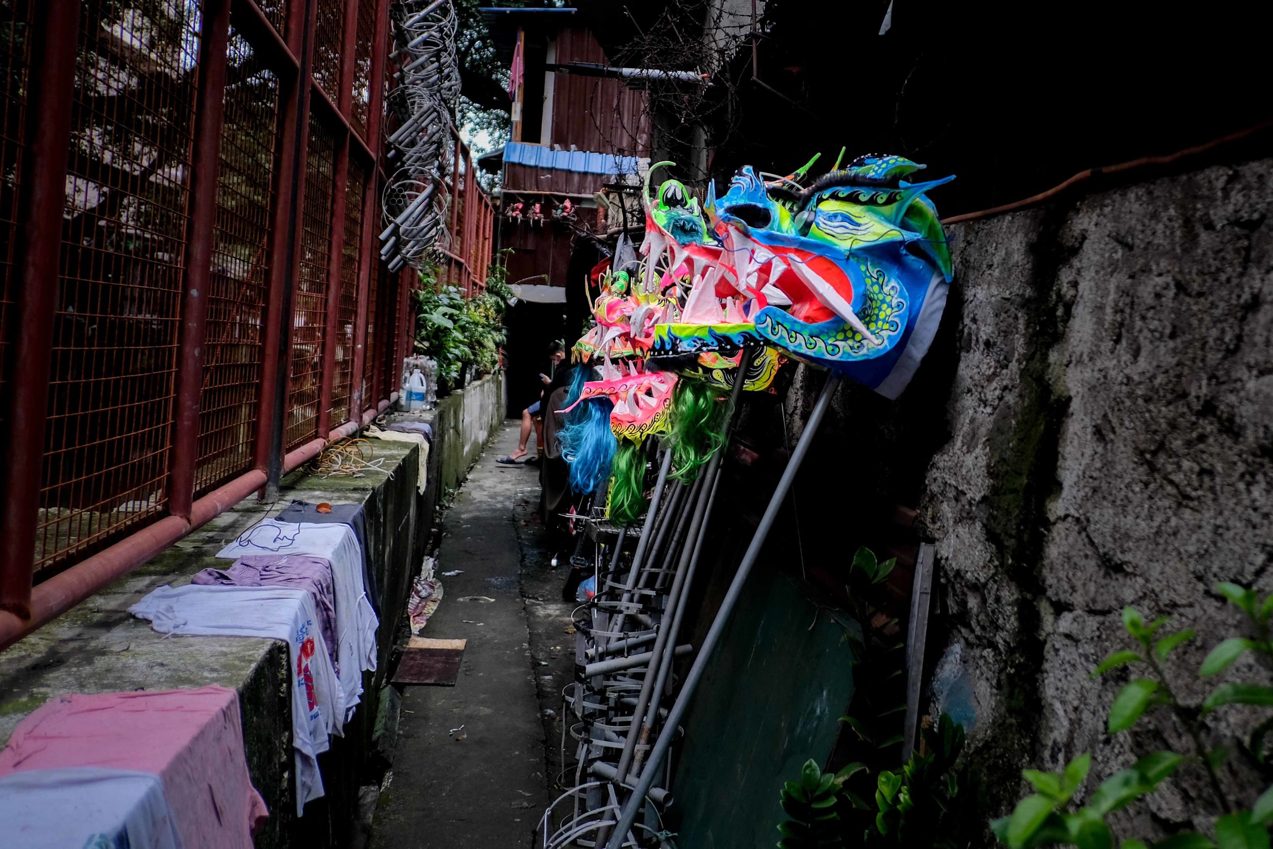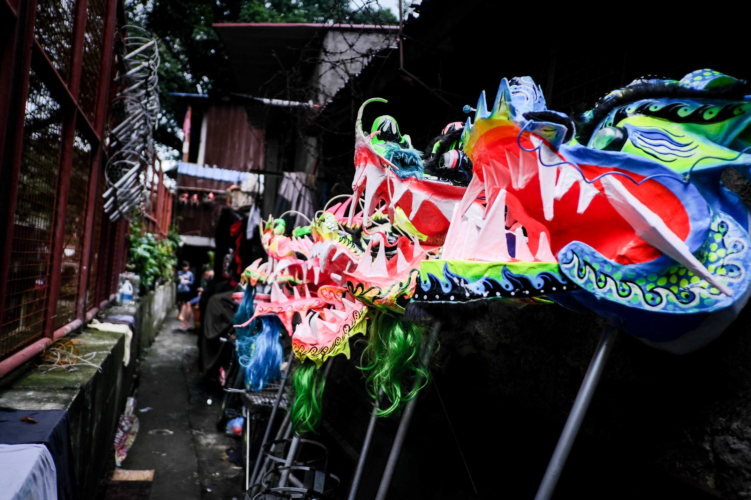 Sicat family members line up dragon heads in the alley leading to the family compound in Binondo, Manila. (Photo by Jojo Riñoza)